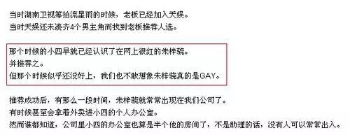事情是这样开始的,2010年4月。一个疑似是小四公司员工在网上爆料,称老板跟朱梓骁感情不一般。