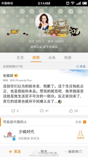 刚不久,张靓颖发了一条特傲娇的微博疑似向网友示威,张靓颖发博后删除:“没按你们的剧本走,抱歉了,想骂就骂吧。反正家回来了,其他的结果也坏不到哪去了。”