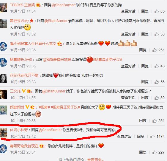 结果,杯具了,该网友被杨幂爸爸艾特出来直接点操,并回复怒骂该网友:你是真傻X呀。我和你妈可是真的。