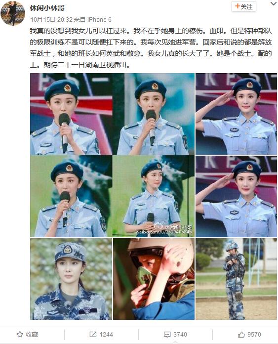 杨幂爸爸在微博上晒出一组杨幂参加《真正男子汉》第二季、身穿军装的照片,并写道“我真的没想到我女儿可以扛过来。我不在乎她身上的檫伤。血印。但是特种部队的极限训练不是可以随便扛下来的。我每次见她进军营。回家后和说的都是解放军战士,和她的班长如何英武和敬意。我女儿真的长大了了。她是个战士。配的上。期待二十一日湖南卫视播出。”言语中,流露出对女儿的关爱之情。