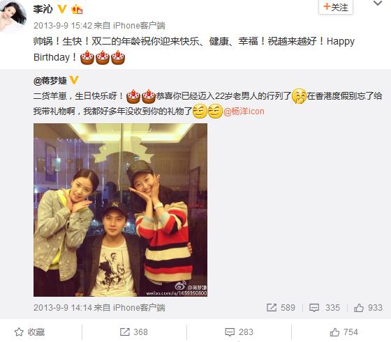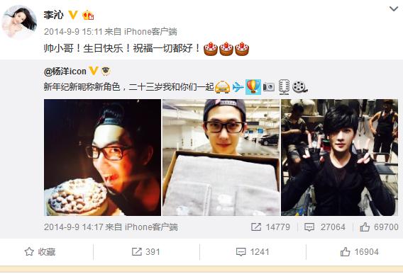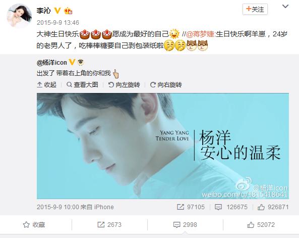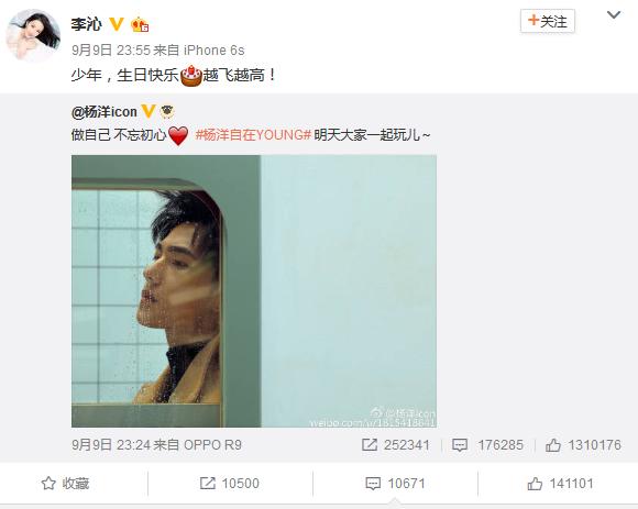 今年的9月9号,李沁很准时的为杨洋送出生日祝福。