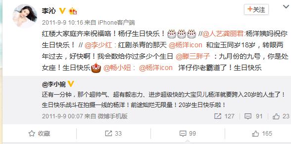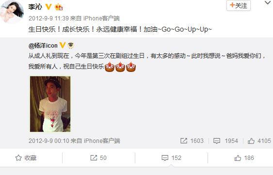 每年的9月9号,李沁都会准时的为杨洋送出生日祝福,称呼也一直在改变,从陌生到亲切。2011年直呼杨洋名字,到如今亲切的呼杨洋为少年、大神。关系真的不一般。