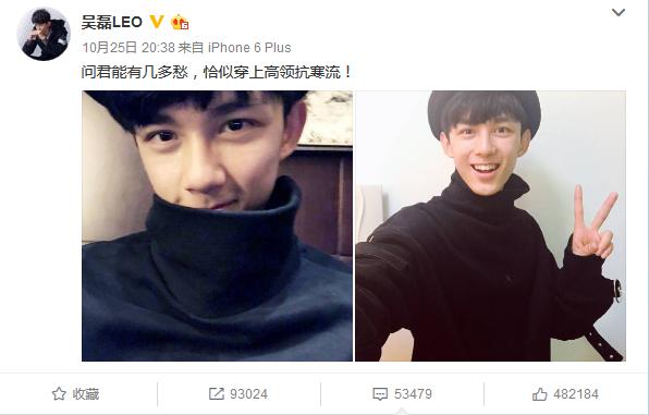 面对与陈乔恩阿姨的谣言,小鲜肉吴磊发了这么一条特萌比的微博:问君能有几多愁,恰似穿上高领抗寒流!疑似在回应谣言。