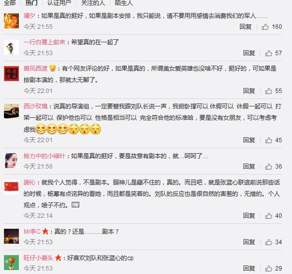 有祝福,喜欢张蓝心和刘队这对CP,他们是绝配。但大部分网友质疑这是剧本。如果是真的挺好,如果是剧本安排,我只能说,请不要用感情去消费我们的军人…