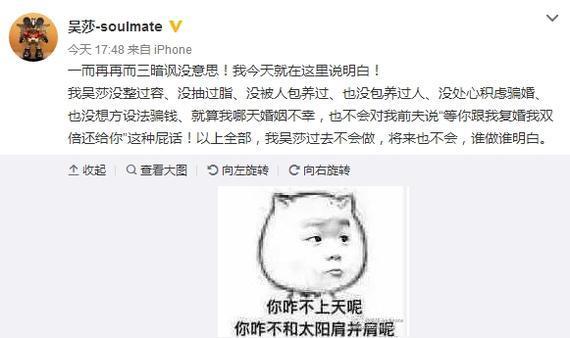 吴莎写道:“一而再再而三暗讽没意思!我今天就在这里说明白!我吴莎没整过容、没抽过脂、没被人包养过、也没包养过人、没处心积虑骗婚、也没想方设法骗钱、就算我哪天婚姻不幸,也不会对我前夫说等你跟我复婚我双倍还给你这种屁话!以上全部,我吴莎过去不会做,将来也不会,谁做谁明白。”