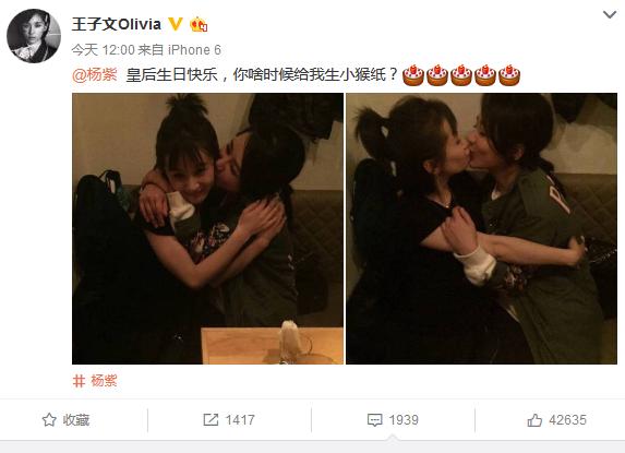 王子文发微博写道: 皇后生日快乐,你啥时候给我生小猴纸?配的图片真的劲爆,王子文和杨紫在嘴对嘴的激吻。这画风真是辣眼睛。