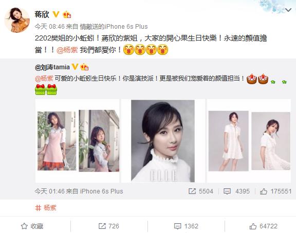 还是来看看《欢乐颂》其他四美的生日祝福吧,刘涛蒋欣的生日祝福的如大姐般温暖贴心,蒋欣转发刘涛的微博,除了延续刘涛的风格,在称呼上也是特别腻人,还夸杨紫是开心果。唯独王子文的生日祝福辣眼睛。