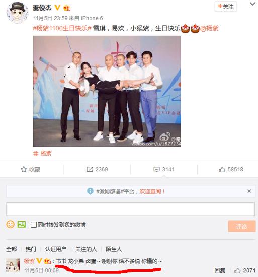 杨紫过生日,男友发微博送祝福,杨紫的回复就如邻家大姐一样:书书 龙小弟 卤蛋~谢谢你 话不多说 你懂的~