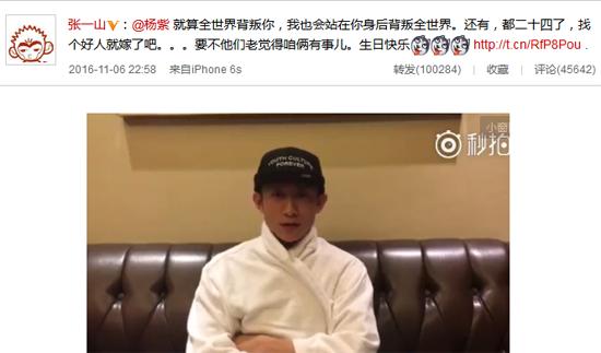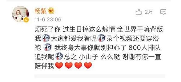 杨紫感谢张一山的祝福,并称:“烦死了你,过生日搞这么煽情,全世界干嘛背叛我?大家都爱我着呢!录个视频还要穿浴袍。