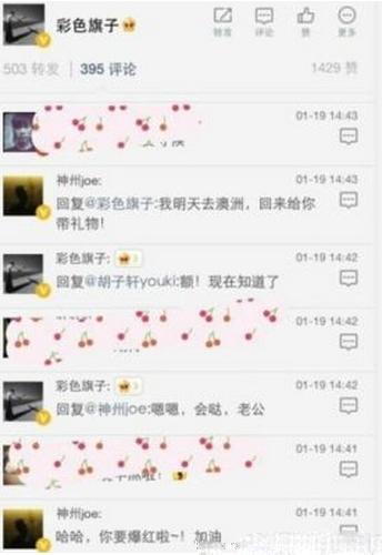 截图中,一名认证为“神州视觉艺术主创”的网民“神州 Joe”1月19日留言道:“哈哈,你要爆红啦!加油!”“小彩旗”则亲密地回应道:“嗯嗯,会哒,老公。”接下来,对方还甜蜜地表示自己将去澳洲,回来给小彩旗带礼物。随后,“小彩旗”的这篇微博就被删除了。