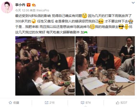 李小冉发微博写道:最近受到N多私信的影响,觉得自己确实有问题,因为几天的打雷下雨就放弃了300多天的,任性又傻瓜 老是拿别人的错误惩罚我自己,才不要这样下去,于是…我肥来啦 而且我以后还是想说神马就说神马,我的地盘我做主,另,这几天我过的灰常好 每天吃着火锅聊着剧本 加油!