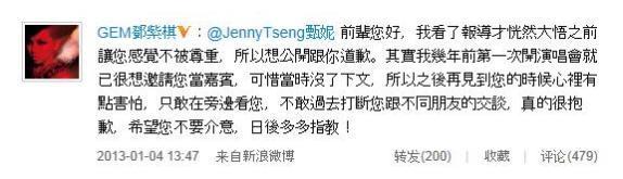 对此,邓紫棋几次向甄妮公开道歉,还发微博认错:解释因当时心里胆怯,所以不敢打扰前辈与朋友的交谈才产生误会。