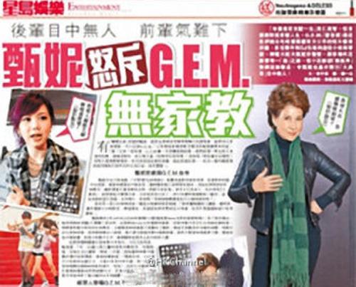 某次活动,邓紫棋和甄妮同台,见到长辈,想不到邓紫棋竟然连招呼都不打,对于邓紫棋的行为,甄妮特生气。随后甄妮在宣传活动时,酱紫说邓紫棋,批的那叫一个毒啊。性格直率的甄妮当众发飙:对方连最基本的家教都没有,面对长辈很没有礼貌,就算歌唱得再好也不重要,其它的事情都要从头学起。