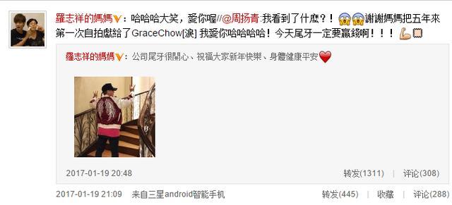 罗志祥妈妈更新微博:“公司尾牙很开心、祝福大家新年快了、身体健康平安”,并发布了她和未来儿媳周扬青的合影。随后周扬青转发:“谢谢妈妈把五年來第一次自拍献給了GraceChow