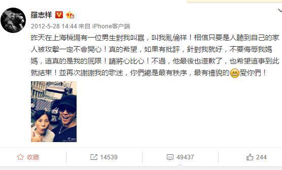 因为和妈妈接吻,罗志祥竟然遭遇网友的指责和攻击,罗志祥曾忍无可忍的发微博吐槽在上海机场遭遇一位男生的当众谩骂。
