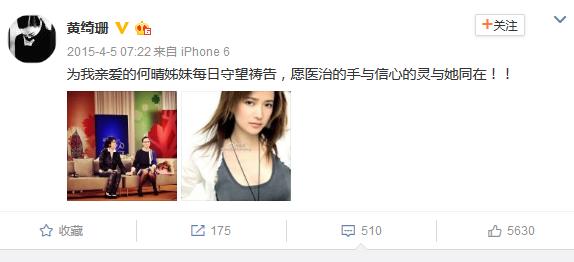 2015年,何晴不幸患病,黄绮珊发微博祝福何晴早日康复,有网友在下面跟帖回复另一位网友:何晴不是脑癌,是脑瘤,手术很成功!我见了晴姐,恢复的不错,气色也好多了,都会好起来的。