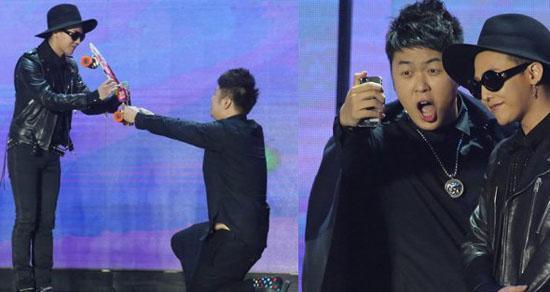 就是这样一个爱染发的“非主流”boy却是Angelababy见了都会娇羞的男神,权志龙以神秘嘉宾的身分亮相跑男,出现了下面一幕,Angelababy激动蹲地(此时,仍能感觉到小明哥受到的一千点伤害)。