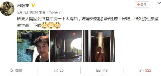 最近,吕颂贤发了条特自恋的微博:并写道:晒完太陽回到浴室沖洗一下太陽油,媳婦突然說我好性感!好吧,很久沒性感過就性感一下唄。