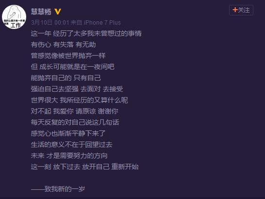 杨慧感触颇深,直言这是“感觉像被世界抛弃一样”的一年。宋喆的出轨与之后的一系列事件让她在漫长的痛苦之后,慢慢意识到只有放下过去的阴影才能重新开始,她在微博上写下:“对不起 我爱你 请原谅 谢谢你。。。。。。生活的意义不在于回望过去。。。。。放下过去,放开自己,重新开始”的话语,鼓励自己开始新的生活。http://si1.go2yd.com/get-image/0Bek9QoGVai