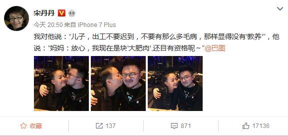 宋丹丹发了条微博,晒出几张和儿子巴图的亲密合影。并教育儿子出工别迟到,不要有那么多的臭毛病,那样显得没教养。并艾特了巴图。http://si1.go2yd.com/get-image/0BjdpDVhX9M