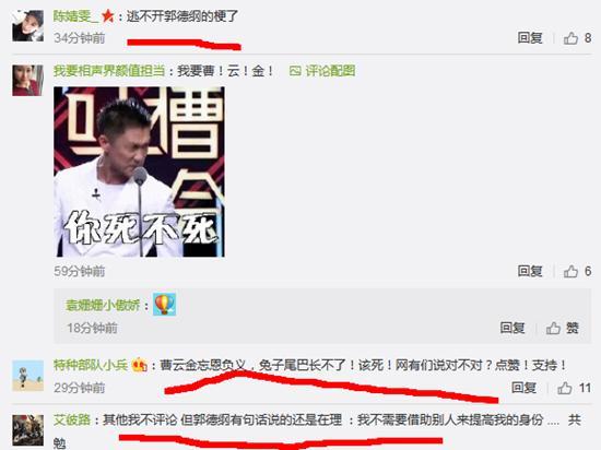 也有网友支持曹云金怼郭德纲:既然郭德纲做的这么绝情,何云伟,曹云金不要占郭德纲便宜,把云还给他,有什么了不起呀,过去不是有一句古话,拨开云雾见日月,云让他郭德纲给拨开了,你们就见到日月了,以后你们一个就叫何阳伟,一个叫曹月经!你们看这名字是多么的高大上呀。