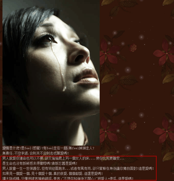 2007年最后一天,陈法蓉又更新博客,标题是“爱情是什么?”,她说:“男人见一个爱十个,见十个爱十个,这还是爱吗?”并且配上了流泪的照片。