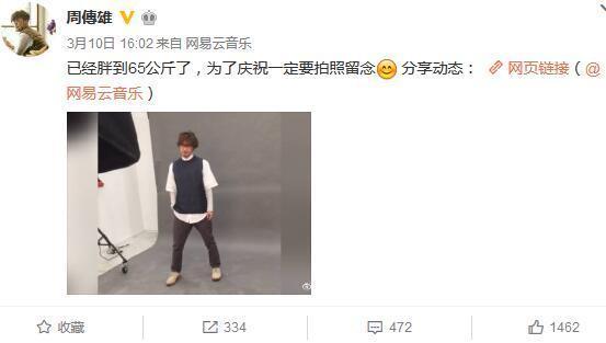 小刚也发微博宣布:已经胖到65公斤了,为了庆祝一定要拍照留念。