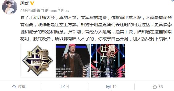 安徽卫视主持一姐周群发微博点评了最近火爆的网综节目《吐槽大会》。http://si1.go2yd.com/get-image/0CHpLXAbTxg