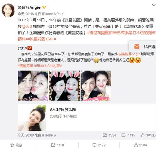 她在转发大S的微博时,写道:“2001年4月12日,16年前《流星花园》开播,是一个美丽梦想的开始,亲爱的熙媛@大S谢谢你一如16年前陪伴着我,并送上美好祝福!是!《流星花园》要重拍了!全新属于你们青春的《流星花园》。”