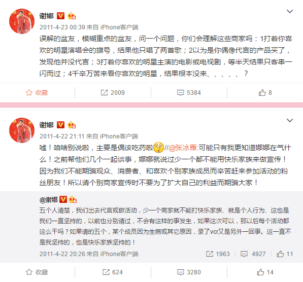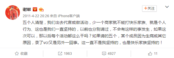 2011年的时候,快乐家族代言广告,但由于经费原因,没有请谢娜。