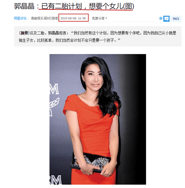 只不过2015年6月,郭晶晶出席活动时打破了之前的流言,并且正式将二胎计划提上日程。