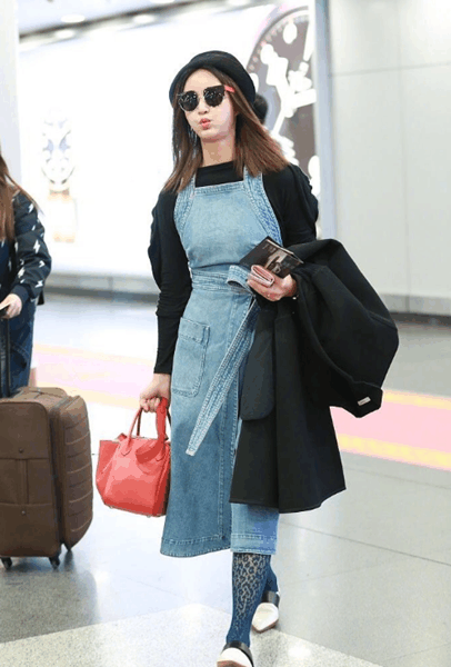 怎么看都觉得这身搭配太奇怪了,张歆艺还特地选了蓝色的丝袜搭配自己的牛仔裙,衣品真棒!