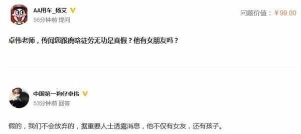 前几天,卓伟在微博回答网友关于鹿晗的提问,网友问“传闻您跟鹿晗徒劳无功是真假?他有女朋友吗?”卓伟表示不会放弃跟拍鹿晗,还称:“据重要人士透露,他不仅有女友,还有孩子。”引发群众围观。