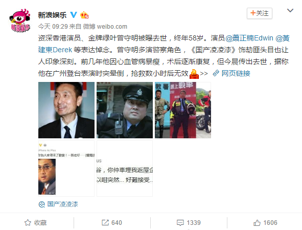 据多家媒体报道,香港资深演员、金牌绿叶曾守明在广州登台表演时突然晕倒,抢救无效后遗憾离世。