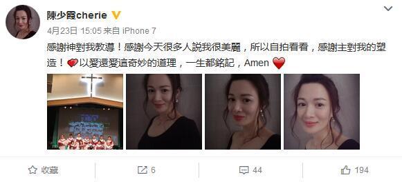 41岁的“双儿”陈少霞通过微博晒自拍照,并称:“感谢神对我教导!感谢今天很多人说我很美丽,所以自拍看看,感谢主对我的塑造!以爱还爱这奇妙的道理,一生都铭记!”