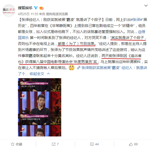 不过不管内幕如何,“妖精会”成员们是不是被公关;至少这件事情是明确发生了的,张译自己也盖章了;另外按照张译的叙事的说法来看,把这件事当成是笑点来分享,实在是一件极其愚昧的事情,也就是大家现在常说的“抖机灵”。