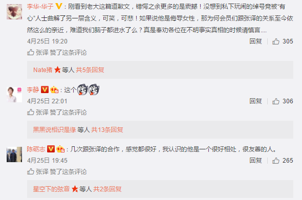 而在张译道歉之后,圈内兄弟李晨刘春、好友李艾等人都过来声援张译,并且李艾还在暗示平时张译都是被女生欺负。