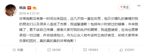 后来,韩庚在微博上道歉,称“非常抱歉没有第一时间出来回应,这几天我一直在反思,包贝尔婚礼的事情对我的朋友们以及很多人造成了伤害,我诚挚道歉!包括年少时做过的错事,本来就错了,更不该自己传播,感谢大家对我的批评和鞭策,我诚恳接受,应当也愿意承担一切过错,并会继续检讨。作为公众人物本该树立良好典范,却给大家带来负面和困扰,真的真的真的非常抱歉!”