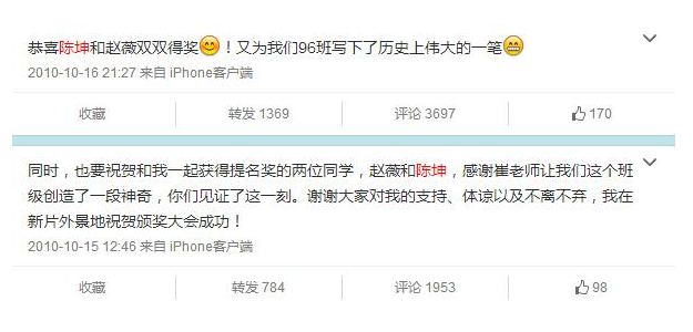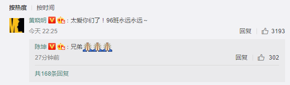 随后黄晓明转发:太爱你们了!96班永远永远。陈坤还称呼黄晓明为兄弟。
