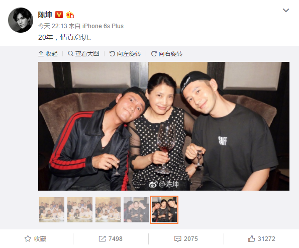 紧接着,陈坤发了同学聚会的照片,并且带上了两人之间的同框照片,并称:20年,情真意切。