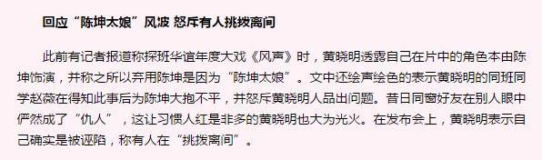不过后来,黄晓明在接受采访时回应了此事,他称此事都是莫须有,十分激动的他甚至称有人在“挑拨离间”,后来也证明赵薇并没有喊话黄晓明,此事才真相大白。
