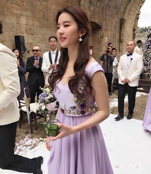 婚礼当天,一袭粉色伴娘装,手捧婚戒的刘亦菲出场就吸引了目光。