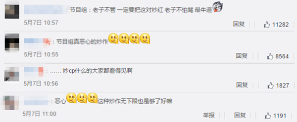 硬炒CP的节目组已经同时引起了双方粉丝的反感,甚至是引起了不小的公愤,如今也是直接导致了双方粉丝互相看不顺眼的现状。