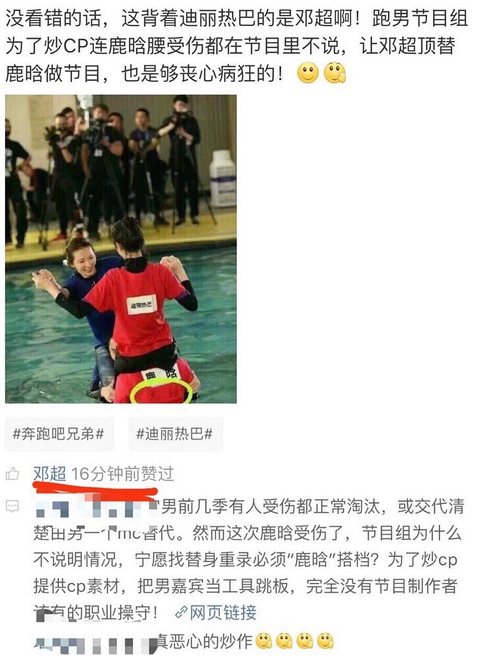 而在网友们大肆谴责节目组的时候,却有网友意外的发现了:邓超点赞针对节目组硬炒CP的微博。