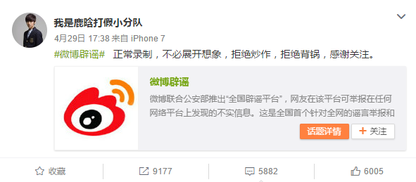 首先是鹿晗工作室的另一个微博账号,在播出之前就明确表示是正常录制,观众不必展开想象,拒绝炒作,拒绝背锅。