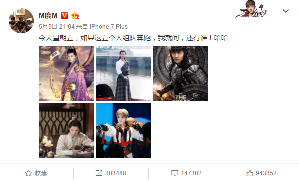 而鹿晗的微博没有和迪丽热巴的互动,PO出的五张照片全是他自己。