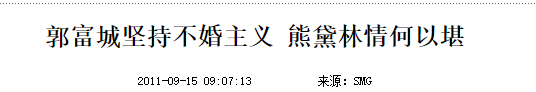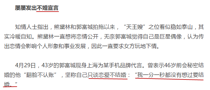 在郭富城与熊黛林还在恋爱期间,许多人一直认为两人会一直携手走下去,但郭富城却不止一次表示自己不想结婚,是名副其实的不婚主义者。