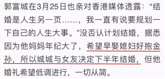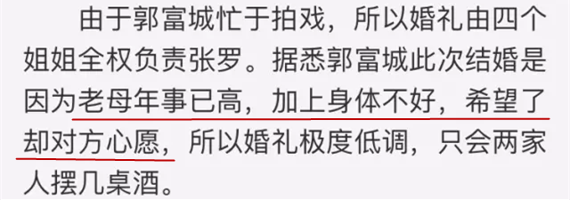 公布婚讯时,郭富城称这是因为母亲的心愿才结的。