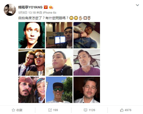 而杨祐宁感受到大家的“关心”后反而不自知,还上传各大男神自拍的对比图,怎么了?自拍角度有问题吗?哈哈哈