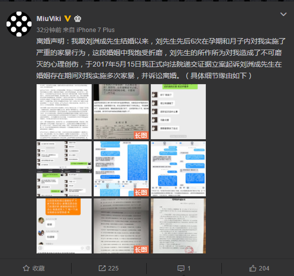 今天,至上励合成员,前快男刘洲成妻子林苗在微博发布离婚声明,重点提到了刘洲成对其先后6次的严重家暴行为,并且其中还包括了孕期家暴!活脱脱的现实版安嘉和!